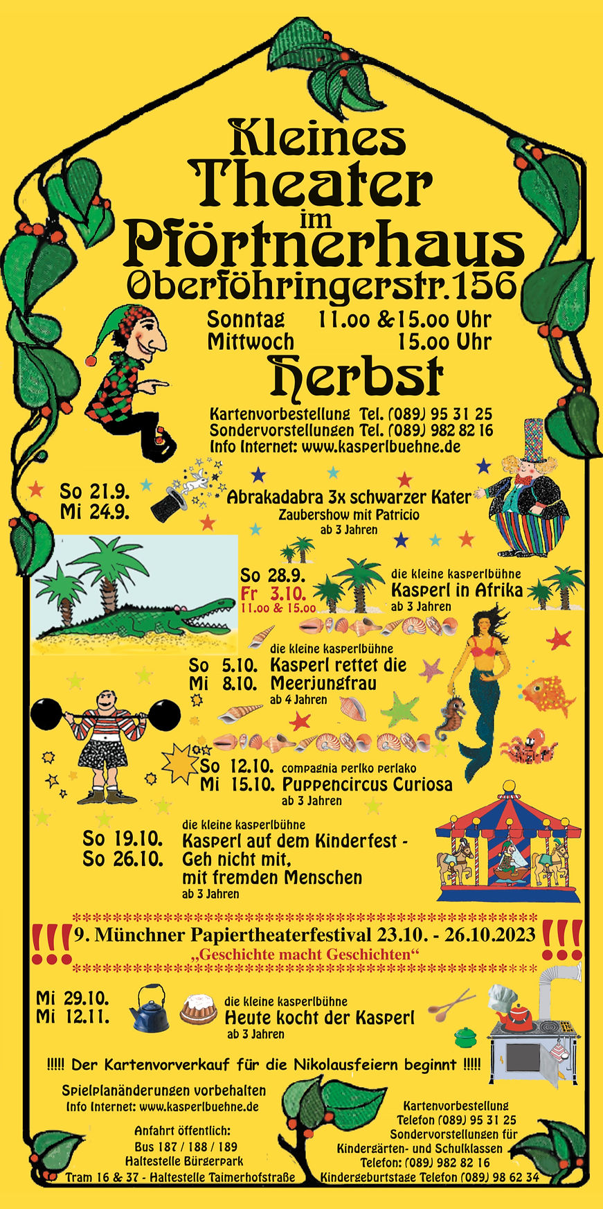 Auf dieser Seite findet ihr den aktuellen Spielplan des Kleinen Theater im Pförtnerhaus. Weitere Informationen zu den einzelnen Kindertheater-Stücken gibt es hier: Theaterstücke